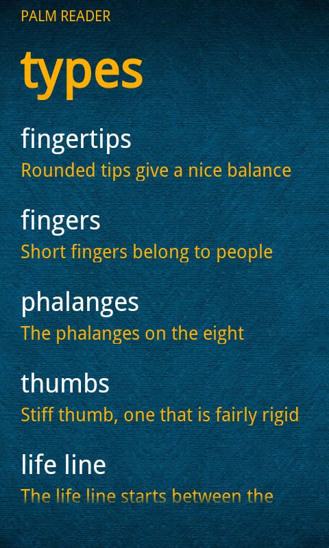 Selecting the correct version will make the palm reading app work better, faster, use less battery power. Palmistry reveals individual personality, character traits, wealth, health and love secrets through the reading of the shape, size and lines of the hands and fingers. And along the way, you'll learn about possibilities around luck, fame, travel, and career. The objective is to evaluate a person's character or future by studying the palm of their hand. In the settings, you can change the design of the application palmistryhd.
